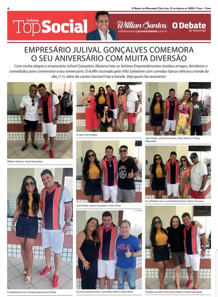 Veja a nossa coluna Top Social no Jornal O Debate do dia 13 com a cobertura especial do aniversário do empresário Julival Gonçalves. Em todas as bancas de São Luís Maranhão