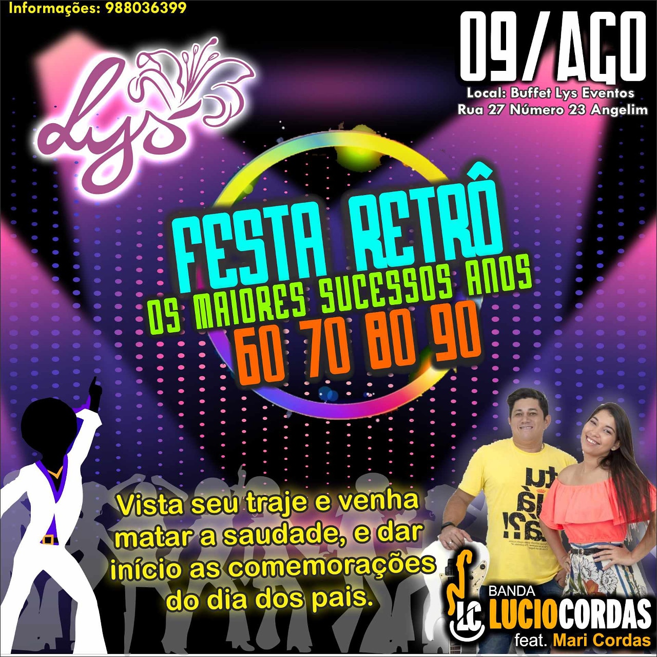 Você quer matar saudade das décadas passadas em um ambiente totalmente retrô? Então essa é a oportunidade ! ???? Vai ser nessa sexta dia 09/08 a partir das 20 horas, no Buffet @lysarteseeventos Angelim com animação do @luciocordas Banda, além também de músicas eletrônicas. Vai ser show ?? Ingressos: R$