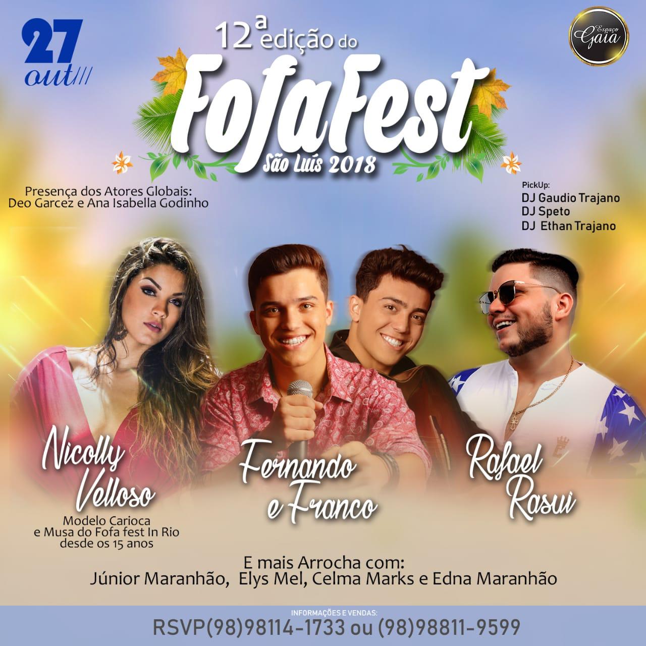 Tudo pronto para o Fofa Fest 2018, evento da colunista Ilze Rangel(Fofa) que será realizado no Espaço Gaia na Av. dos Holandeses, no dia 27 de outubro (sábado) das 13H às 19H e vai contar com atrações mais que especiais, além de uma suculenta feijoada. Já estão confirmadas as presenças